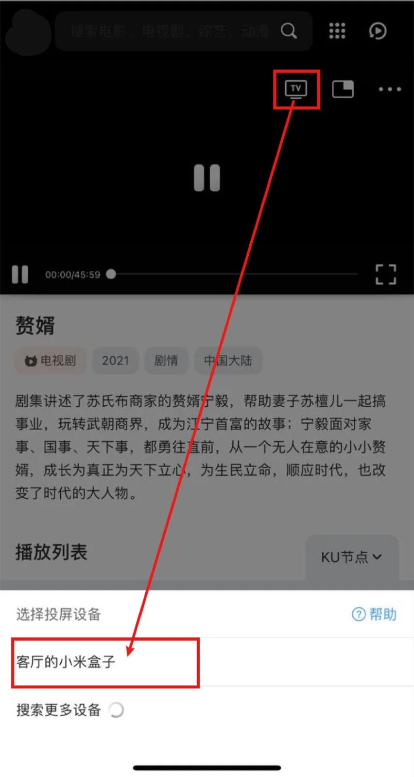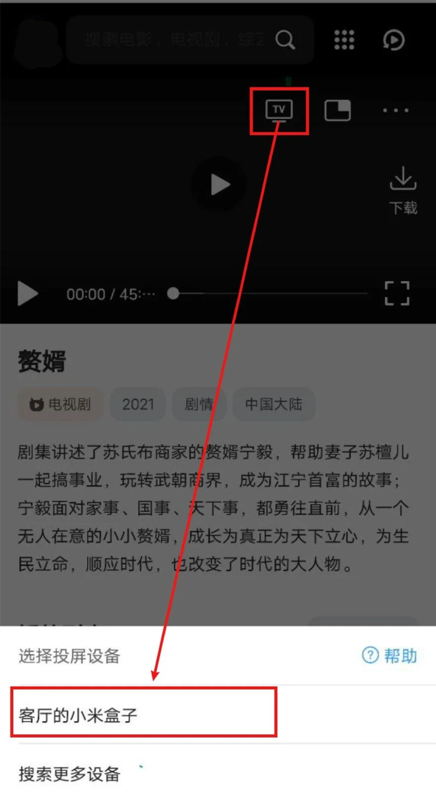 打开QQ浏览器(会接管网页播放器)->打开清清影视->播放视频->选中投屏图标->等待搜寻出智能电视/电视盒子->选中,即可投屏。